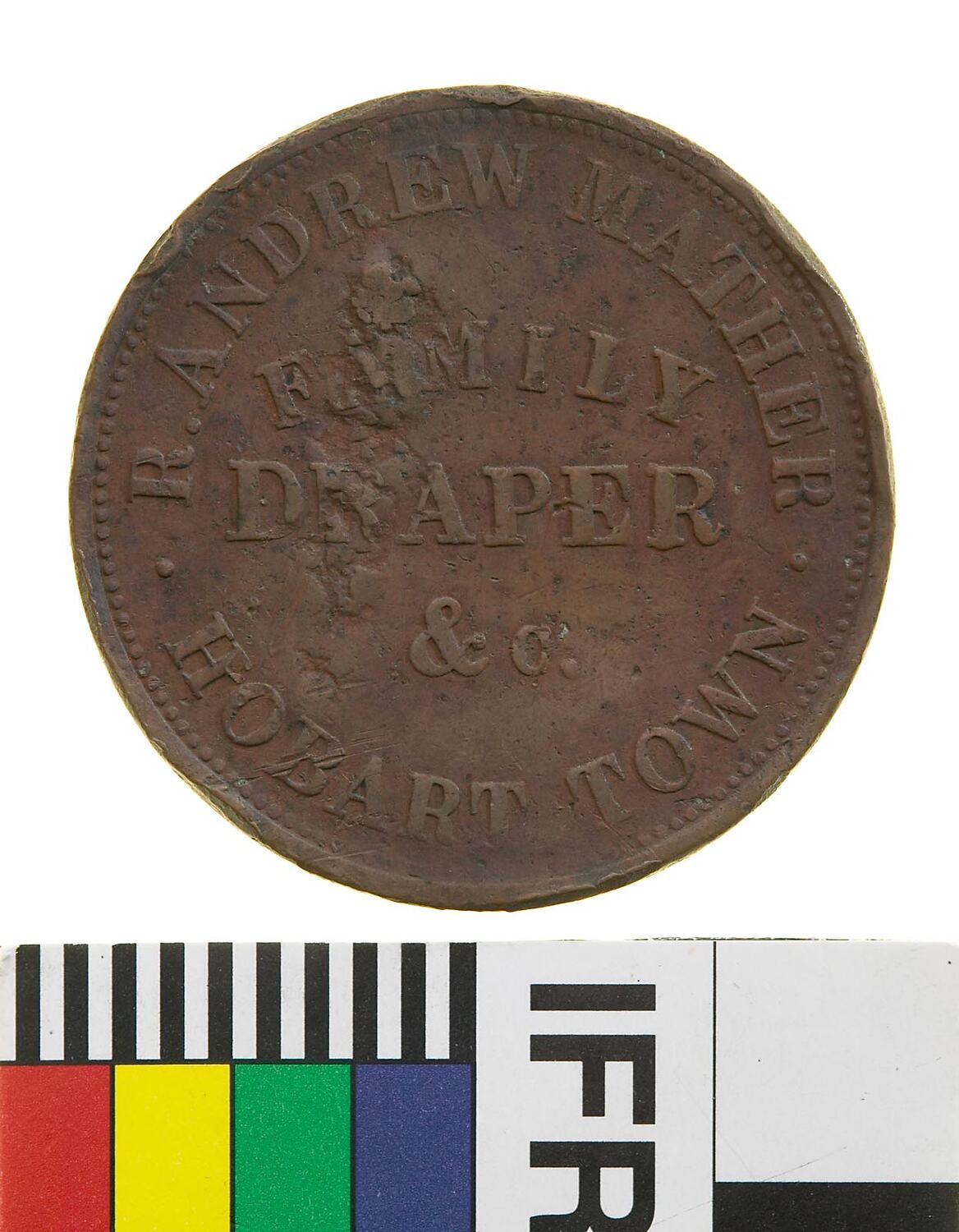 Copper One Penny Token, minted by Heaton & Sons, Birmingham, circa 1855-1860. Issued by R. Andrew Mather, Family Draper, Hobart, Tasmania. Surcharged D. Wood. The Mather family firm was established in 1823 by Robert Andrew Mather Snr, who had arrived in Hobart with his wife Ann in 1822. Robert Andrew Mather Jnr was born and educated in Tasmania and managed the business from the late 1840s until his retirement in 1876, when his sons Robert and Thomas took control, changing the name of the store to Andrew Mather and Co.. Thomas retired from the business in 1894, and Robert was still managing the store in 1910, assisted by his two sons.