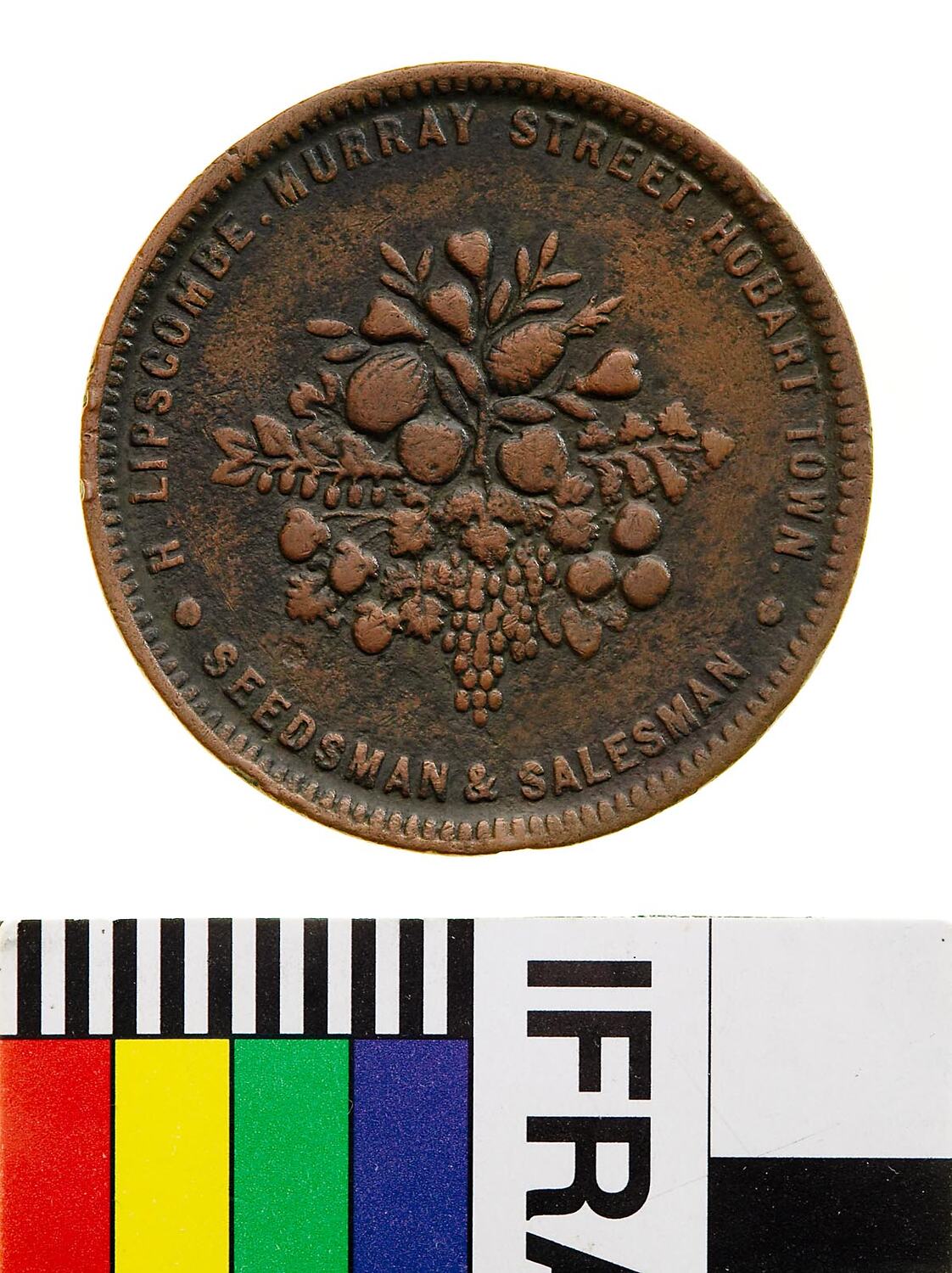 A round copper token (34 mm diameter) featuring the name, address and business of the issuer: H. Lipscombe, Murray St. Hobart Town, seedsman, salesman and shipping supply agent. It features a bouquet of produce that includes grapes, apples, pears, mellon and pineapple. This token has been cleaned