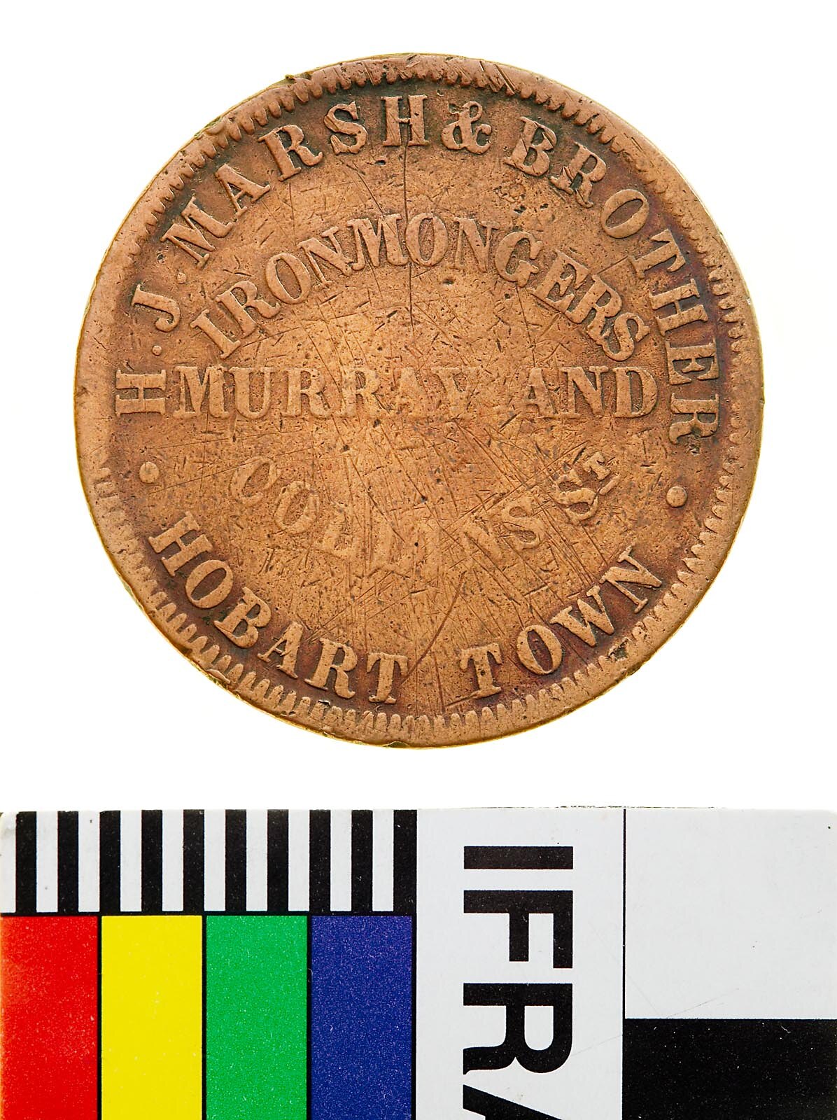 Copper One Penny Token, minted by an unknown British mint. Issued by H.J. Marsh & Brother, Ironmongers, Hobart, circa 1855. On 26 April 1850 Henry James Marsh opened an ironmongery and paint shop at the corner of Murray and William Streets. It is believed that he entered into a partnership with his brother Samuel Charles Marsh in 1853, but Samuel died the following year. In 1867 the firm was known as H.J. Marsh and Co., and in 1912 the firm was absorbed by Harris and Marsh. H.J. Marsh died on 28 April 1897.