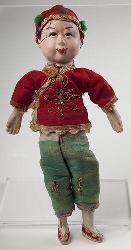 Painted finely ground wood pulp head, arms and legs. It has the appearance of ceramic but is not. Body made from woven fabric stuffed with sawdust. The doll wears a costume consisting of a red shirt with gold trim, green pants and red shoes. Shirt and pants embroidered with silk and metallic gold thread. Doll wears a red hat with two green pom poms. The hat is adhered to the doll's head.