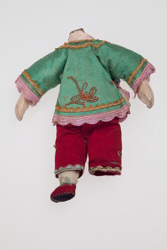 Painted stoneware head (missing, neck still present), lower arms and legs with body made from woven fabric stuffed with sawdust. The doll wears a costume consisting of a green silk shirt with pink trim, red pants and red shoes. Shirt and pants embroidered with silk and metallic gold thread.