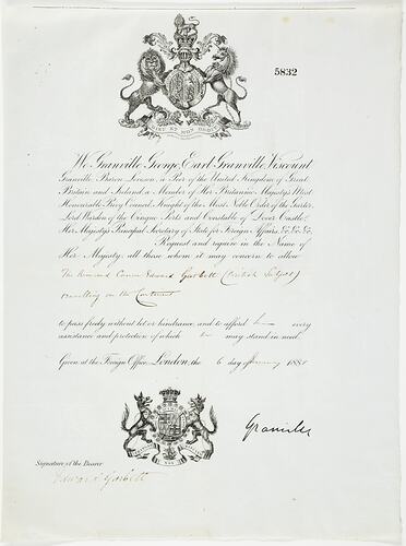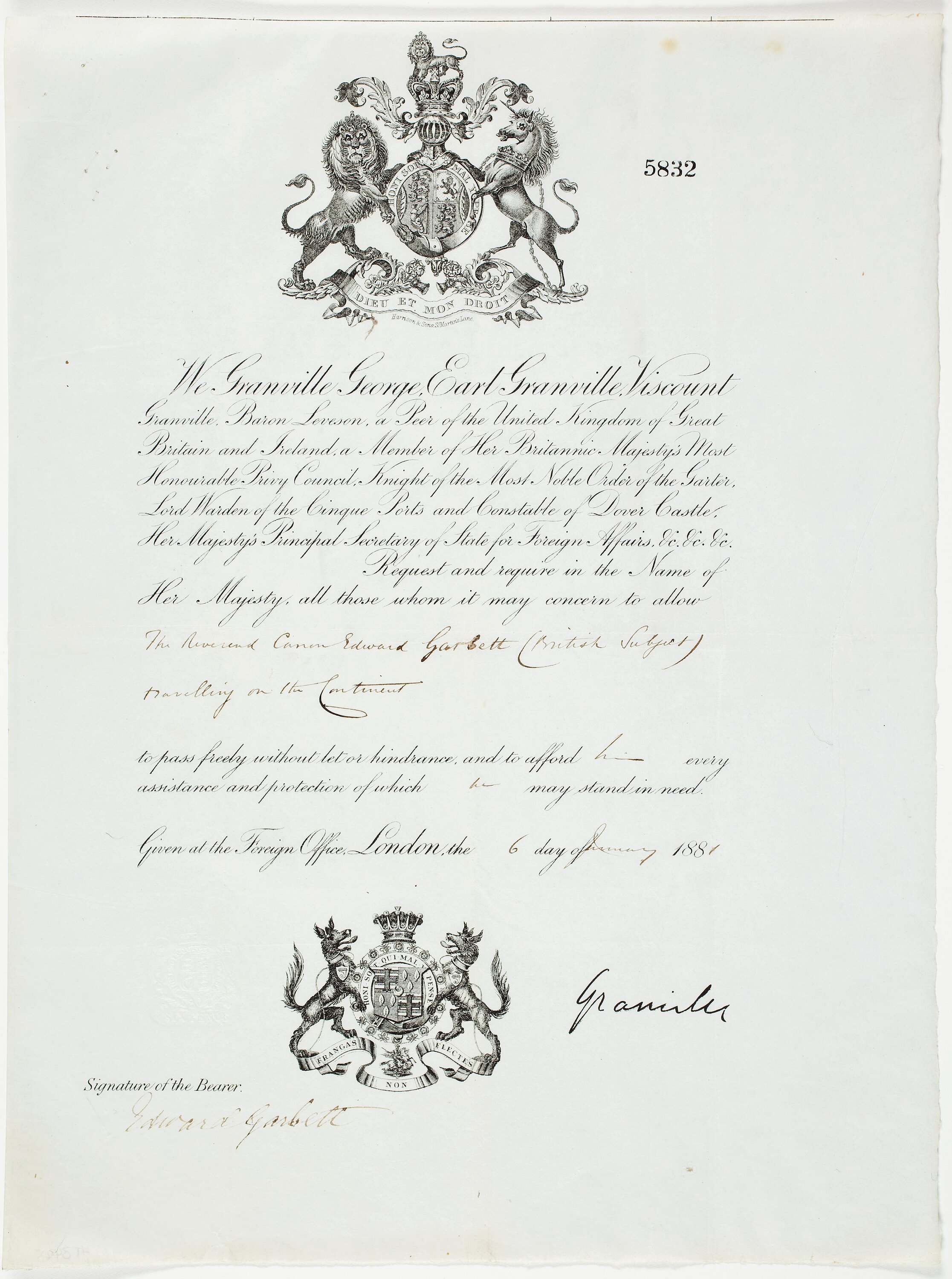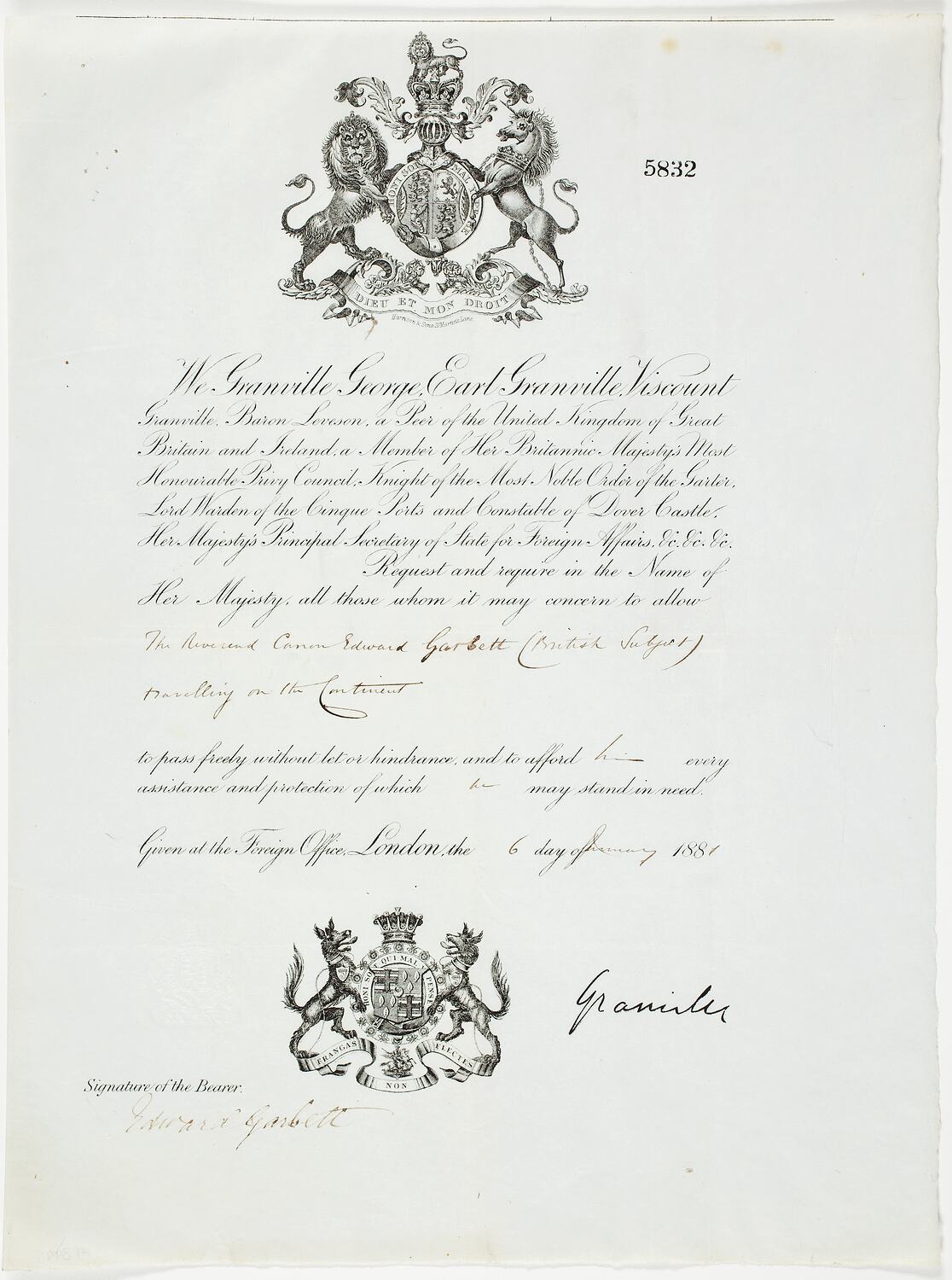 Printed: We Granville George Earl Granville Viscount / Granville Baron Levson, a Peer of the United Kinddom of Great / Britain and Ireland a Member of Her Britannic Majesty's Most / Honourable Privy Council, Knight of the Most Nobel Order of the Garter, / Lord Warden of the Cinque Ports and Constable of Dover Cstle, Her Majesty's Principal Secretary of State for Foreign Affairs Ec. Ec. Ec. / Request and esquire in the Name of Her Majesty, all those whom it may concern to allow / Reverend Edward Garbett (British Subject) travelling / on the Continent / to pass freely without let or hindrance, and to afford him every / assistance and protection of which he may stand in need. / Given at the Foreign Office London the 6 day of January 1881