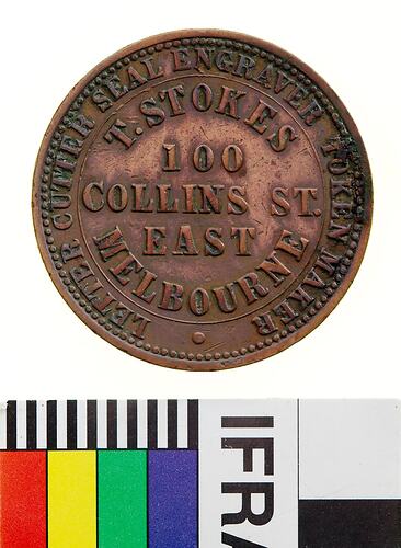 Copper one Penny token, minted by Thomas Stokes of Melbourne, circa 1862. Issued by Thomas Stokes, Diesinker, Token Maker & Medallist, Melbourne. This token is one of the large number of anonymous tokens struck by Stokes late in 1862. Anonymous issues were manufactured employing two stock dies. Thomas Stokes migrated to Australia in search of gold in the 1850s, being unsuccessful he returned to his trade as a die-maker and button maker. In 1857 Stokes acquired a press from W.J. Taylor and began to mint large numbers of tradesmen's tokens. He also commenced the Australian Medallic Issues. In 1873 Stokes took a partner, Martin, and the business was re-named Stokes & Martin. In 1893 a disastrous fire damaged a large portion of the business, Martin had forgotten to renew the fire insurance policy, and the partnership was dissolved as a result. Stokes rebuilt the business as Stokes & Son. The business became a proprietary concern in 1911, re-named Stokes & Son Pty Ltd. In 1935 the business moved to Brunswick, and in 1962 Stokes became a public company, renamed Stokes (Australasia) Pty Ltd. Today the business is located in Ringwood.