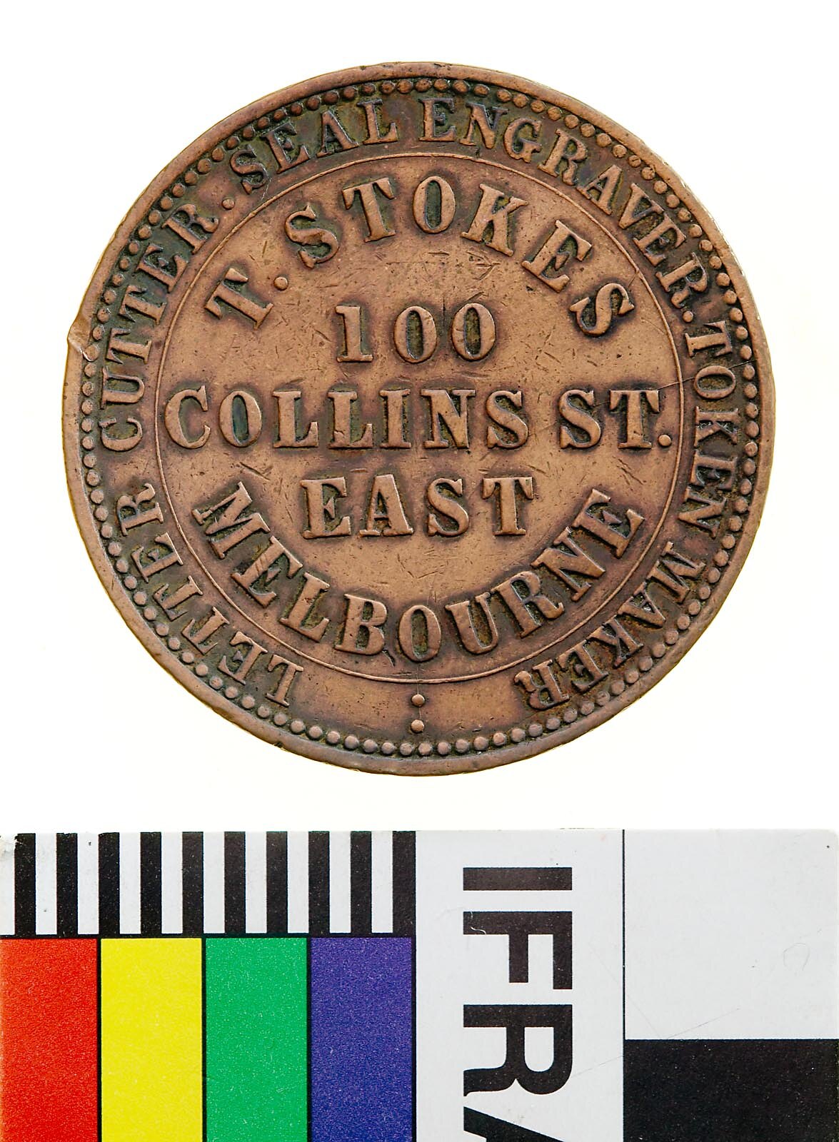 Obverse: T. STOKES 100 COLLINS ST EAST MELBOURNE LETTER CUTTER . SEAL ENGRAVER . TOKEN MAKER : Reverse: VICTORIA 1862 IN VINO VERITAS T. STOKES MAKER MEL