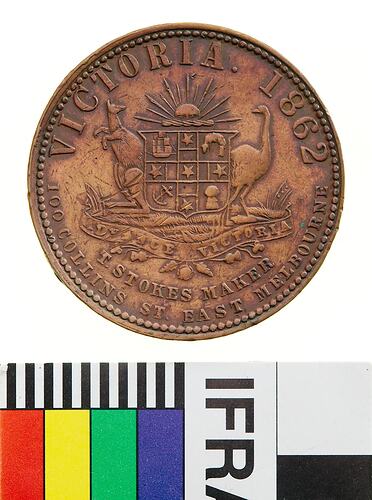 Coat of arms consisting of a central shield set on grass covered ground and below Rising Sun. On left a kangaroo seated facing out but head back towards sun (sejant sinister reguardant) and on right emu with similar stance (passant dexter reguardant). Below ground line and set on bouquet of rose, thistles and shamrock, a ribbon with the motto ADVANCE VICTORIA. The shield is quartered by a cross with a star at the centre and at the end of each arm. The cross is not shaded. The quarters contain: top left, a three-masted sailing ship; top right, a golden fleece; bottom left, an anchor; and bottom right, a wheat sheaf. Around above, VICTORIA . 1862 around below in two lines, T. STOKES MAKER / 100 COLLINS ST. EAST MELBOURNE. The neck of the emu is poorly engraved with additional line to the left, the T of EAST is below the letters AK of MAKER. The standard references for the die used to make this token are: Andrews 13 = Heyde Arms 5 = Sharples Arms 6.