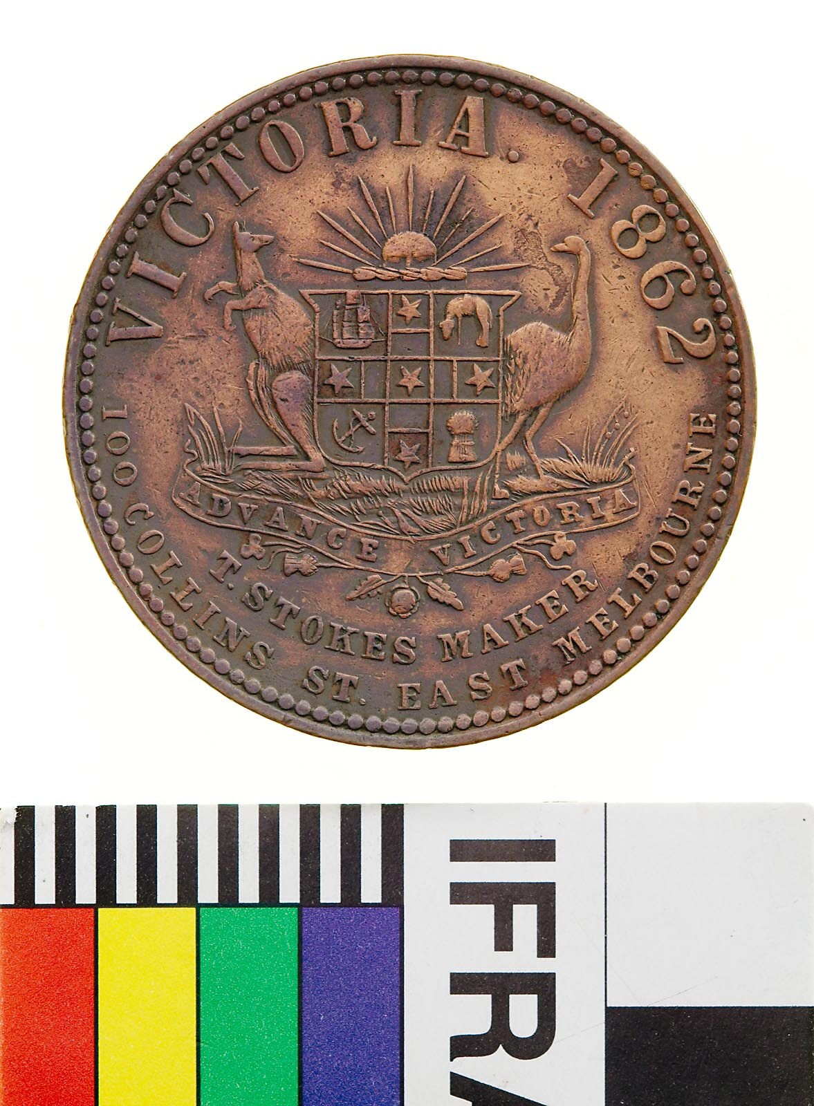 Coat of arms consisting of a central shield set on grass covered ground and below Rising Sun. On left a kangaroo seated facing out but head back towards sun (sejant sinister reguardant) and on right emu with similar stance (passant dexter reguardant). Below ground line and set on bouquet of rose, thistles and shamrock, a ribbon with the motto ADVANCE VICTORIA. The shield is quartered by a cross with a star at the centre and at the end of each arm. The cross is not shaded. The quarters contain: top left, a three-masted sailing ship; top right, a golden fleece; bottom left, an anchor; and bottom right, a wheat sheaf. Around above, VICTORIA . 1862 around below in two lines, T. STOKES MAKER / 100 COLLINS ST. EAST MELBOURNE. The neck of the emu is poorly engraved with additional line to the left, the T of EAST is below the letters AK of MAKER. The standard references for the die used to make this token are: Andrews 13 = Heyde Arms 5 = Sharples Arms 6.