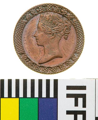 At centre a crowned head of Queen Victoria facing left within a broad machine-turned rim that bears the incuse legend VICTORIA AUSTRALIA.