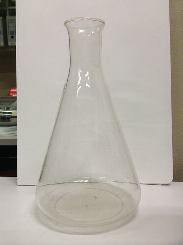 Glass Erlenmeyer flask, 1000mL. Routine laboratory glassware. Used by Commonwealth Serum Laboratories (CSL) Limited, Parkville, Victoria. About 1970.