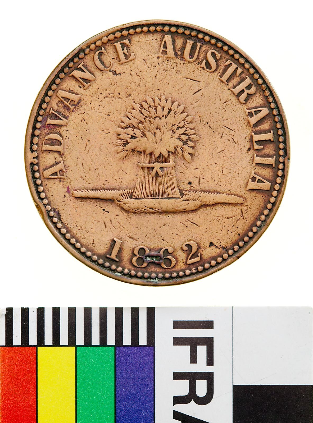 At centre a wheat sheaf tied with a cord 4.7 mm long, above, ADVANCE AUSTRALIA; below, 1862 border of 114 beads. (Stock reverse Andrews type 21 = Heyde Sheaf 1 = Sharples Sheaf 1) weakly struck