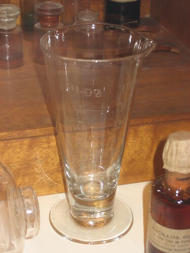 Glass beaker used to measure apothecary chemicals at CSL (Commonwealth Serum Laboratories), Parkville, circa 1900. Four were handblown at CSL and the other four were manufactured by CCG Australia. Also includes a measuring jar.