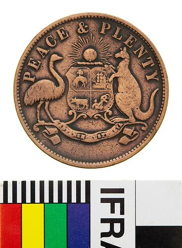 A round copper token (34 mm diameter) without the name of an issuer or mint. The obverse (so called as the seated Justice type is normally a reverse) features a coat of arms consisting of a central shield below a rising sun with emu and kangaroo supporters. The shield is quartered and contains: top left, Golden Fleece, top right, three masted sailing ship, bottom left bull standing facing left, bottom right, anchor. The supporters stand on a pair of simple curved lines which also hold the base of the shield, a ribbon bearing the motto ADVANCE AUSTRALIA is draped across these lines below their feet. Around above, PEACE & PLENTY. The reverse features a female figure representing Justice seated on a wool bale with legs to left but her head and upper body to front. A wine barrel lies on the ground behind her and a three-masted sailing ship sails to the right on the horizon to the left. She wears a blindfold and extends a balanced set of scales with her right hand. With her left she holds an inverted cornucopia from which fruits flow onto the ground. She wears an ancient-style of flowing dress bound at the waist, her left arm bare and right draped to near the elbow. Around above, MELBOURNE VICTORIA, in exergue, 1858. This token has been cleaned