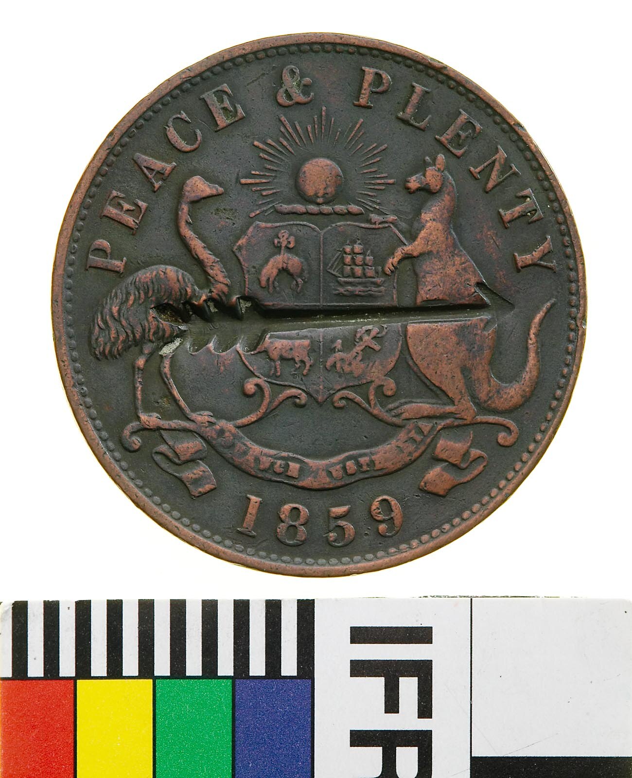 Australian arms with kangaroo and emu supporters counterstamped with an arrow; above PEACE & PLENTY, below 1859