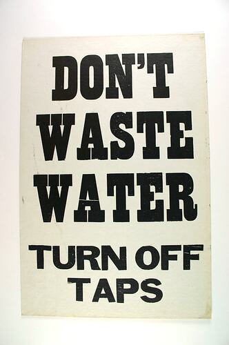 Water Conservation Sign. Thought to be used in the late 1960s - early 1970s. Displayed around Newmarket Saleyards.
