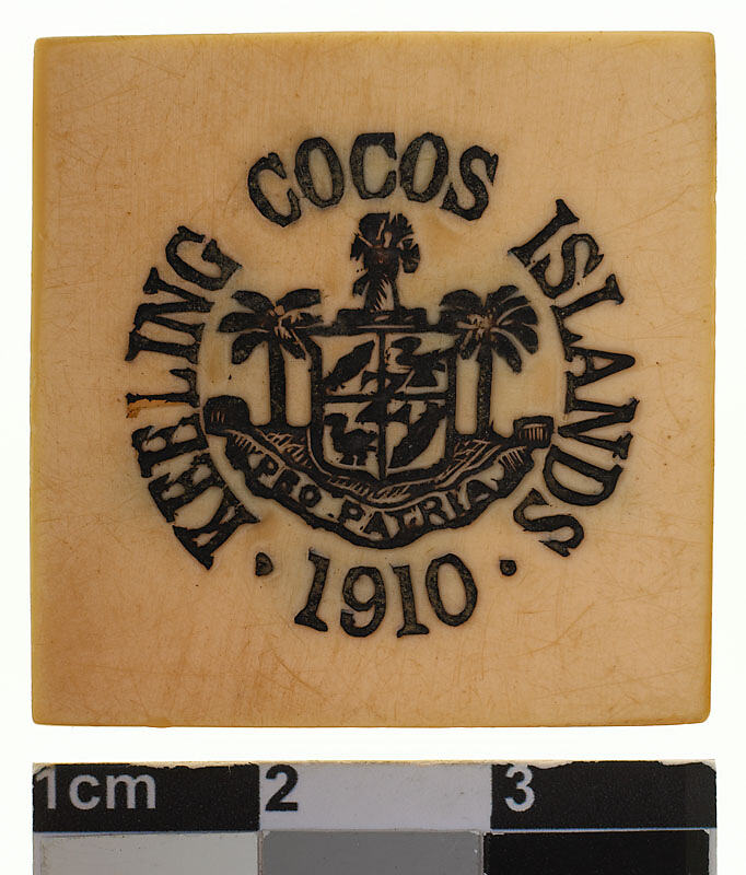 An square shaped ivorine (cellulose nitrate) token printed in black; at centre Arms with motto PRO PATRIA; around, KEELING COCOS ISLANDS . 1910 . and on the reverse in four lines, 1337 / R.1 / J.S.CLUNIES ROSS / 1913
