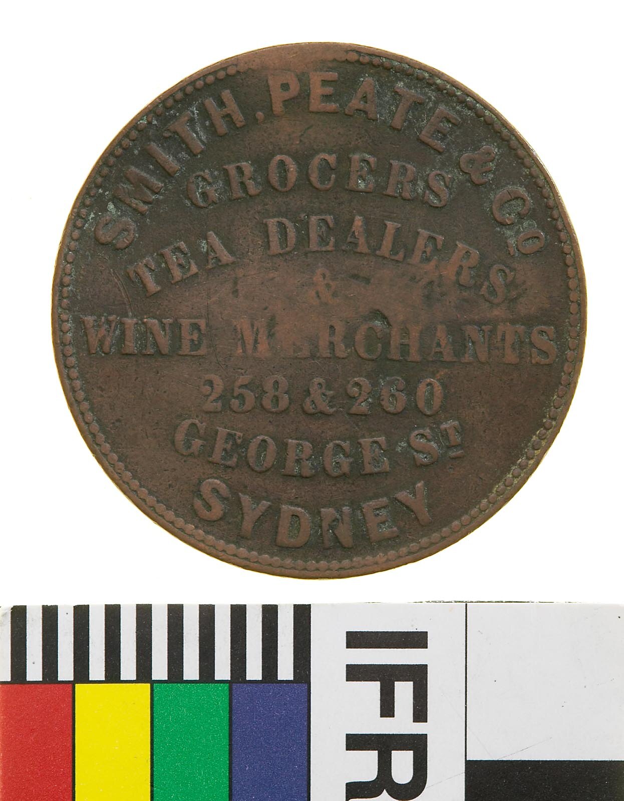 A round copper token (34 mm diameter). The token design featuring the name, address, business and foundation date of the issuer: Smith, Peate and Co., 258 & 260 George Street Sydney, grocers, tea dealers, wine merchants. The reverse depicts Justice standing facing left, blindfolded and extending balanced scales from her right hand, her left hand rests on an inverted cornucopiae from which fruits flow. A sailing ship is seen on the horizon to the left of the figure. Surcharged in three lines WILSON / ENGRAVER / 390 PITT S