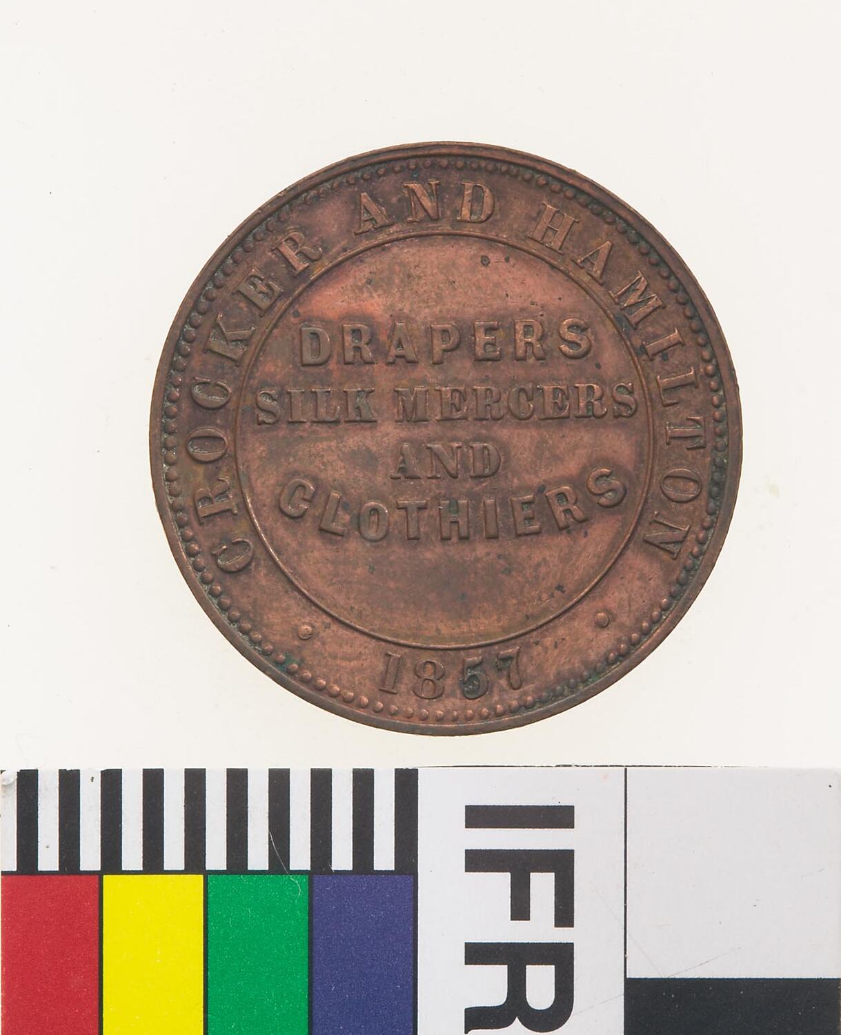 Copper Halfpenny Token, minted by an unknown British Mint. Issued by Crocker & Hamilton, Drapers & Clothiers, Adelaide, circa 1857. The firm Crocker & Hamilton, Drapers, were in business from at least 1854. They are listed in Howell's Adelaide Directory for 1858, although the partnership must have been dissolved between the time Howell collected the listings for his directory and July of that year as during that month advertisements appeared in the Adelaide Advertiser informing the public that Crocker & Co. were 'SELLING OFF, SELLING OFF. - Crocker & Co. beg to inform the public of South Australia that they have determined on relinquishing the DRAPERY TRADE.' These advertisements continued until September 1858, indicating that the public had not cleared the stock of Crocker & Co. at any great pace.