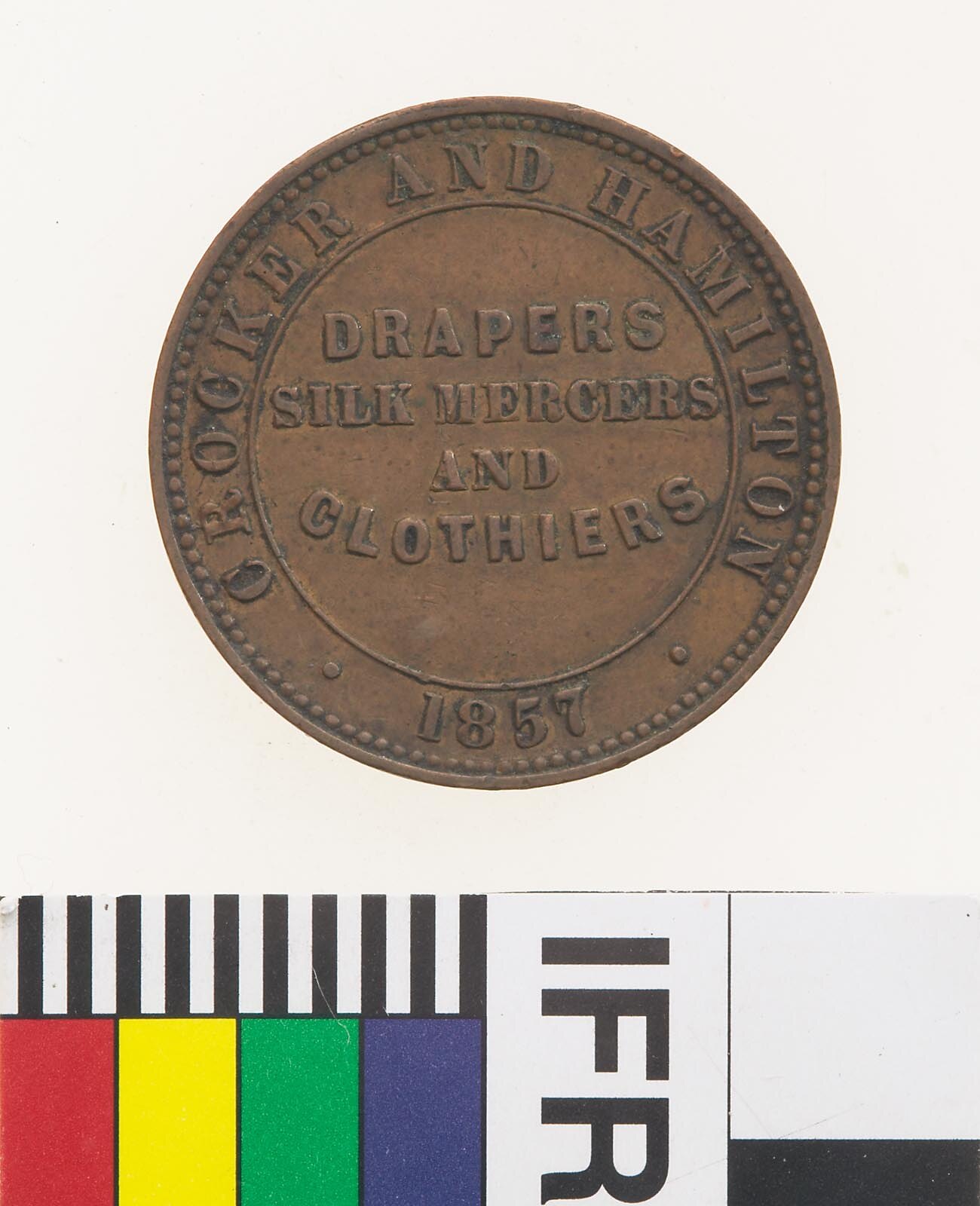 Copper Halfpenny Token, minted by an unknown British Mint. Issued by Crocker & Hamilton, Drapers & Clothiers, Adelaide, circa 1857. The firm Crocker & Hamilton, Drapers, were in business from at least 1854. They are listed in Howell's Adelaide Directory for 1858, although the partnership must have been dissolved between the time Howell collected the listings for his directory and July of that year as during that month advertisements appeared in the Adelaide Advertiser informing the public that Crocker & Co. were 'SELLING OFF, SELLING OFF. - Crocker & Co. beg to inform the public of South Australia that they have determined on relinquishing the DRAPERY TRADE.' These advertisements continued until September 1858, indicating that the public had not cleared the stock of Crocker & Co. at any great pace.