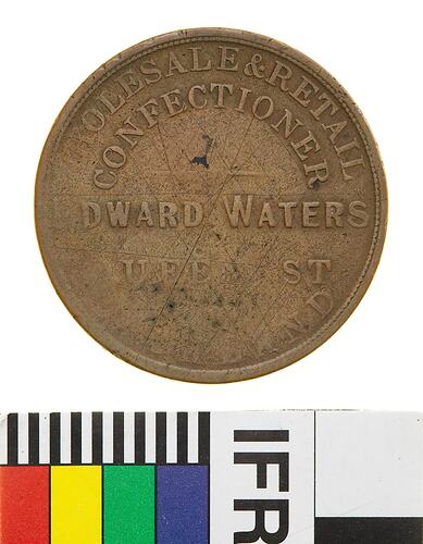 Copper One Penny Token, minted by Stokes & Martin, Melbourne. Issued by Edward Waters, Confectioner, Auckland, circa 1872. The reverse die was cut by Julius Hogarth. Edward Waters owned a Coffee Palace (Temperance Hotel) in Auckland, which was the rendezvous of Pacific Island Traders and sailors. He was interested in pearl fishing and was well known to the roving South Sea mariners. He was also a wholesale and retail confectioner in which capacity he issued his penny tokens.