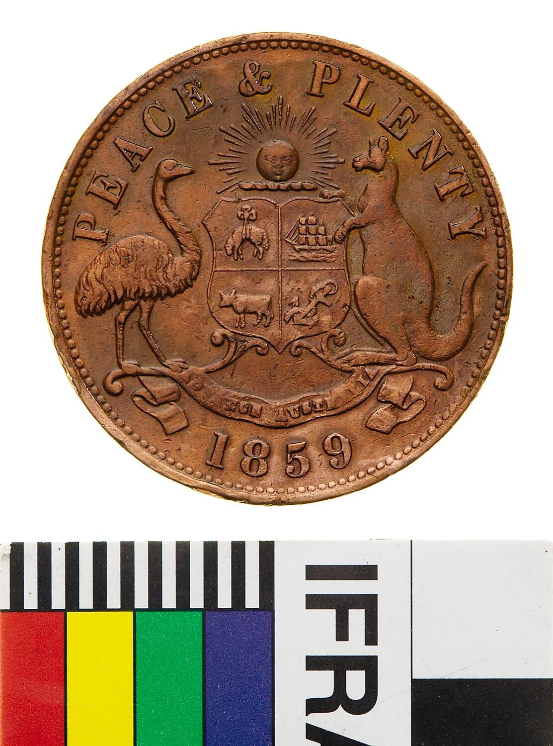 Coat of arms consisting of a central shield below a rising sun with emu and kangaroo supporters. The shield is quartered and contains: top left, Golden Fleece, top right, three masted sailing ship, bottom left bull standing facing left, bottom right, anchor. The supporters stand on a pair of simple curved lines which also hold the base of the shield, a ribbon bearing the motto ADVANCE AUSTRALIA is draped across these lines below their feet. Around above, PEACE & PLENTY; below, 1859.