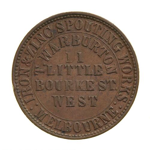 Copper One Penny Token minted by Thomas Stokes, Melbourne. Issued by T. Warburton, Iron & Zinc Spouting Works, Melbourne, 1862. Mr & Mrs Warburton arrived in Melbourne on New Year's Day 1954, after working in various jobs the couple established Thomas Warburton Pty. Ltd. in 1858 at 384 Bourke Street, Melbourne where it remained for 108 years. They ran the business together until 1871 when Thomas was killed, with Mrs Warburton managing the business until 1886. She then passed the management to Thomas H. and Ada Warburton. Thomas Warburton Pty. Ltd is today owned by the owned by the multinational Wurth Group. The company is based in Mulgrave, with branches at Sunshine, Kilsyth, Ballarat and Campbellfield.