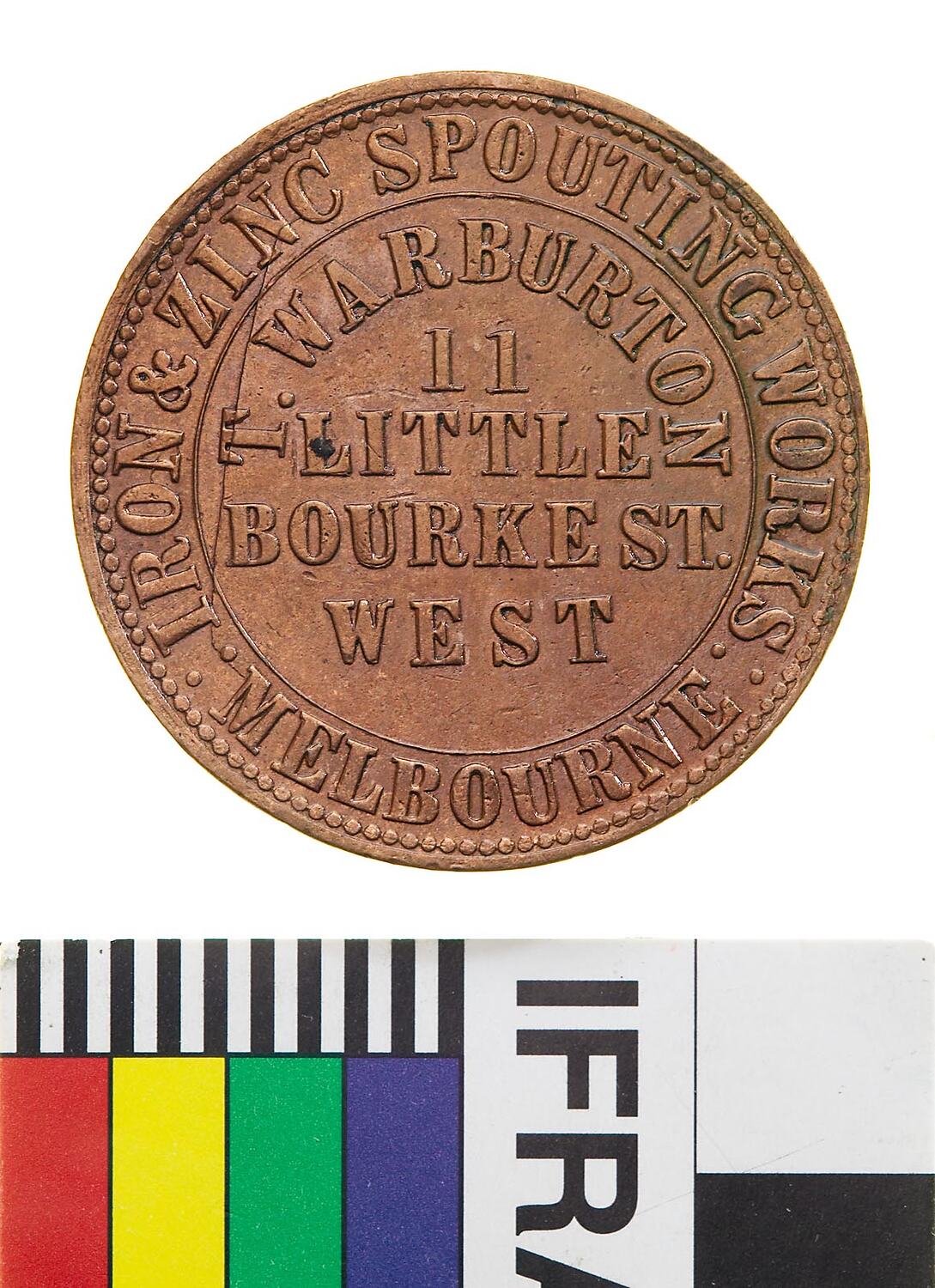 Obverse: T. WARBURTON 11 LITTLE COLLINS ST. WEST MELBOURNE IRON & ZINC SPOUTING WORKS Reverse: VICTORIA 1862 T. STOKES MAKER 100 COLLINS ST EAST MELBOURNE
