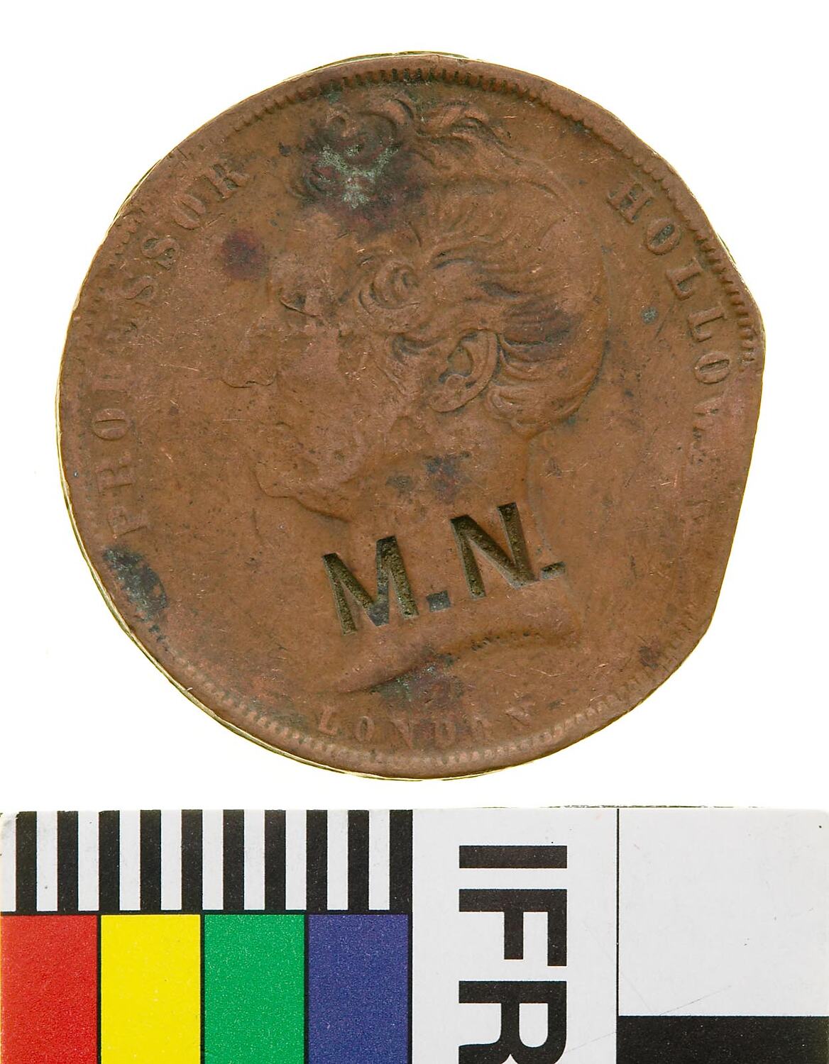 Head of Professor Holloway facing left with J. MOORE (the maker's name) incuse on neck truncation; around, PROFESSOR HOLLOWAY; below, LONDON, surcharged M.N.