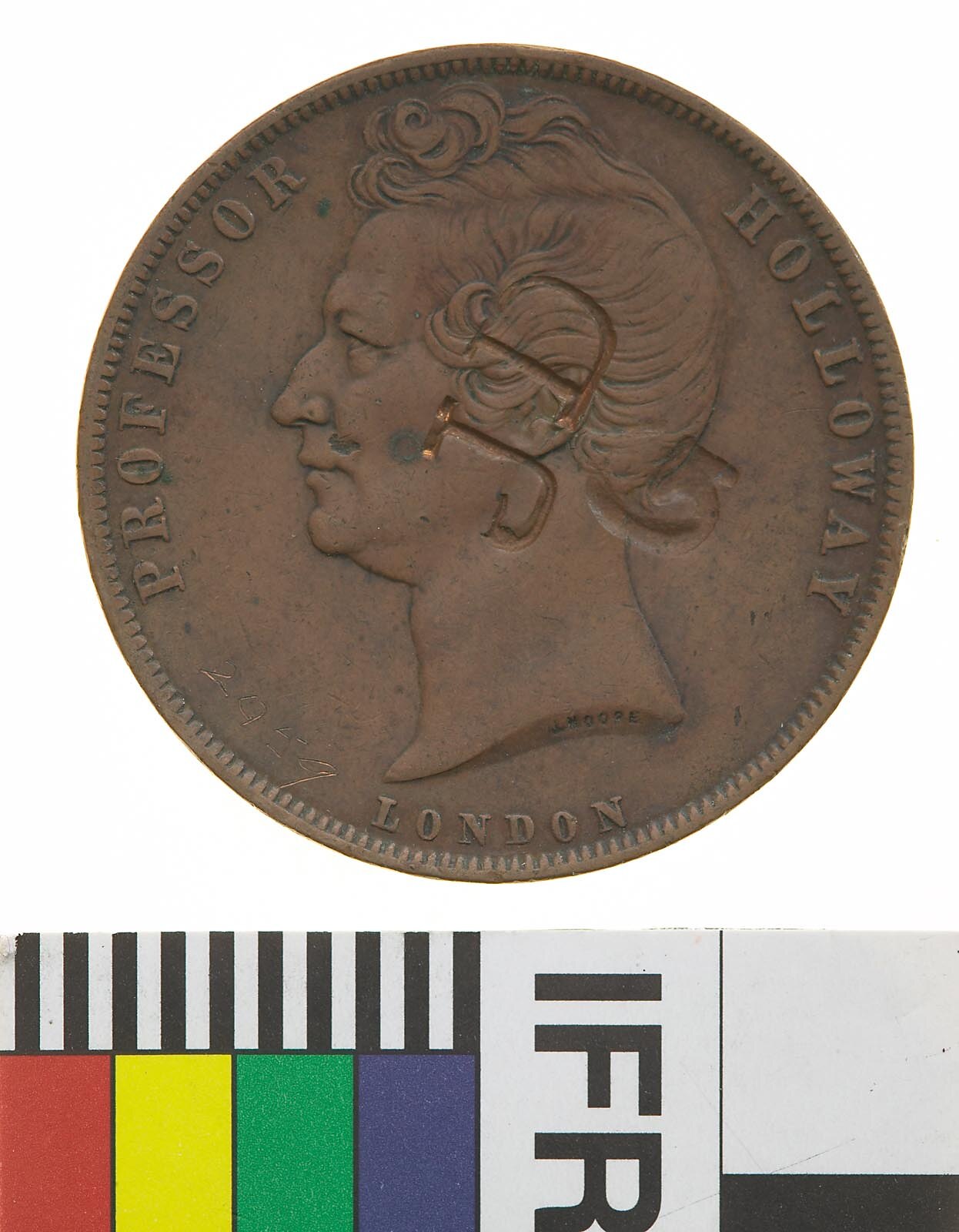 Head of Professor Holloway facing left with J. MOORE (the maker's name) incuse on neck truncation; around, PROFESSOR HOLLOWAY; below, LONDON, surcharged in two lines JD / G
