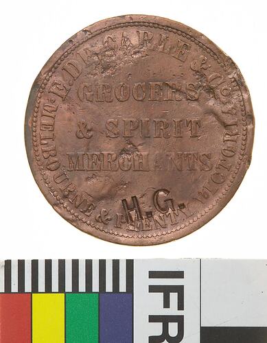 Copper One Penny Token, minted by Pope & Co, Birmingham. Issued by E. De Carle & Co, Grocers & Spirit Merchant, Melbourne, circa 1853. Surcharged H.G. Mr. E. De Carle arrived in Australia in 1849. Over the following fourteen years he was involved in a wide range of business ventures in Melbourne, taking advantage of the explosive growth caused by the gold rush. He later moved to New Zealand, where he died. De Carle's three different tokens, which featured his business as 'Grocers and Spirit Merchants,' 'Auctioneers and Land Agents' and 'Auctioneers, etc.,' indicated the range of his business activities and speculation. He was also involved in the urbanisation of Footscray and a section of Brunswick. De Carle operated his businesses with a number of partners, in a network of business dealings.
