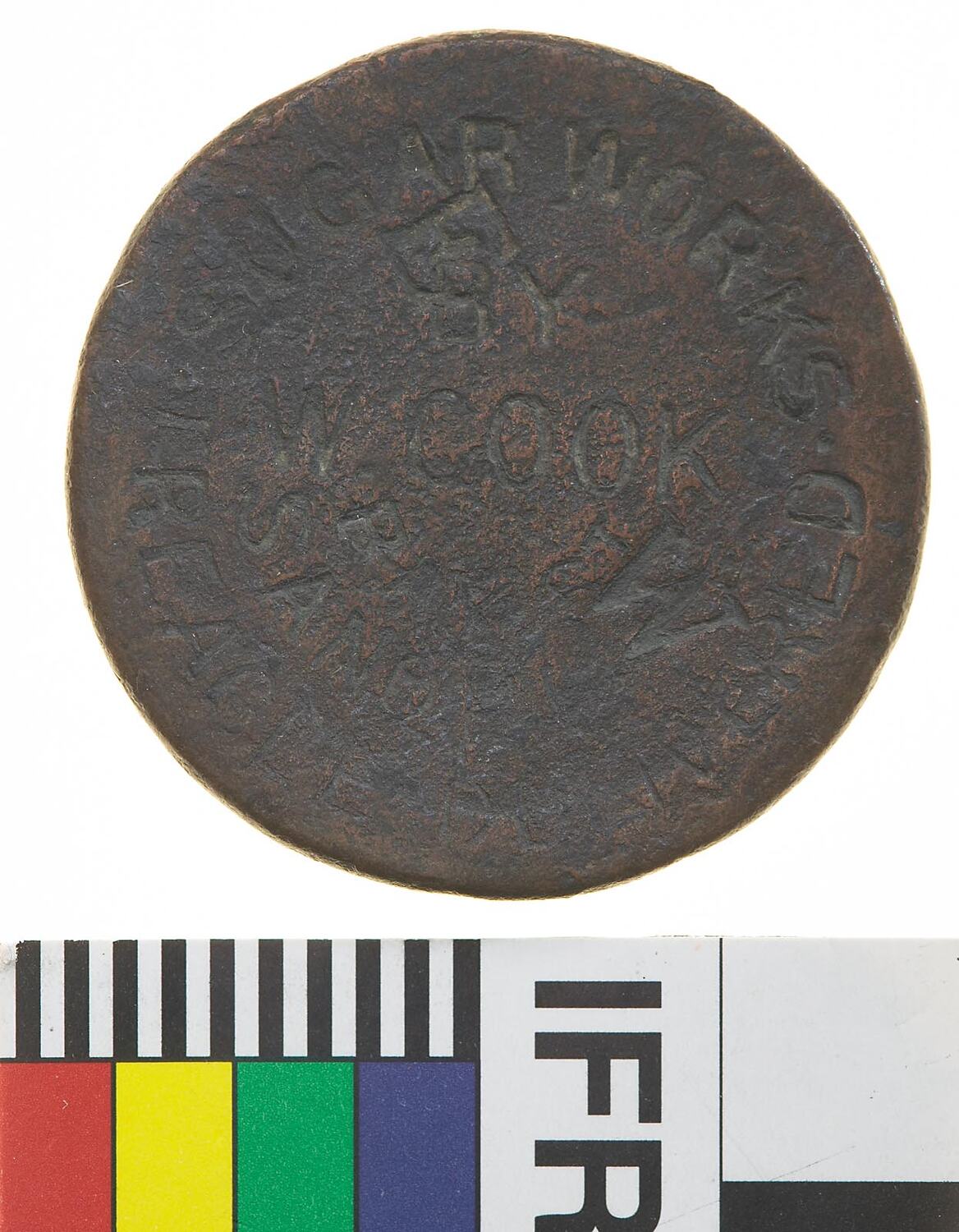 Obverse: BY W.C. COOK BAY ST SANDRIDGE SUGAR WORKS TREACLE DELIVERED and E W Reverse: F P N