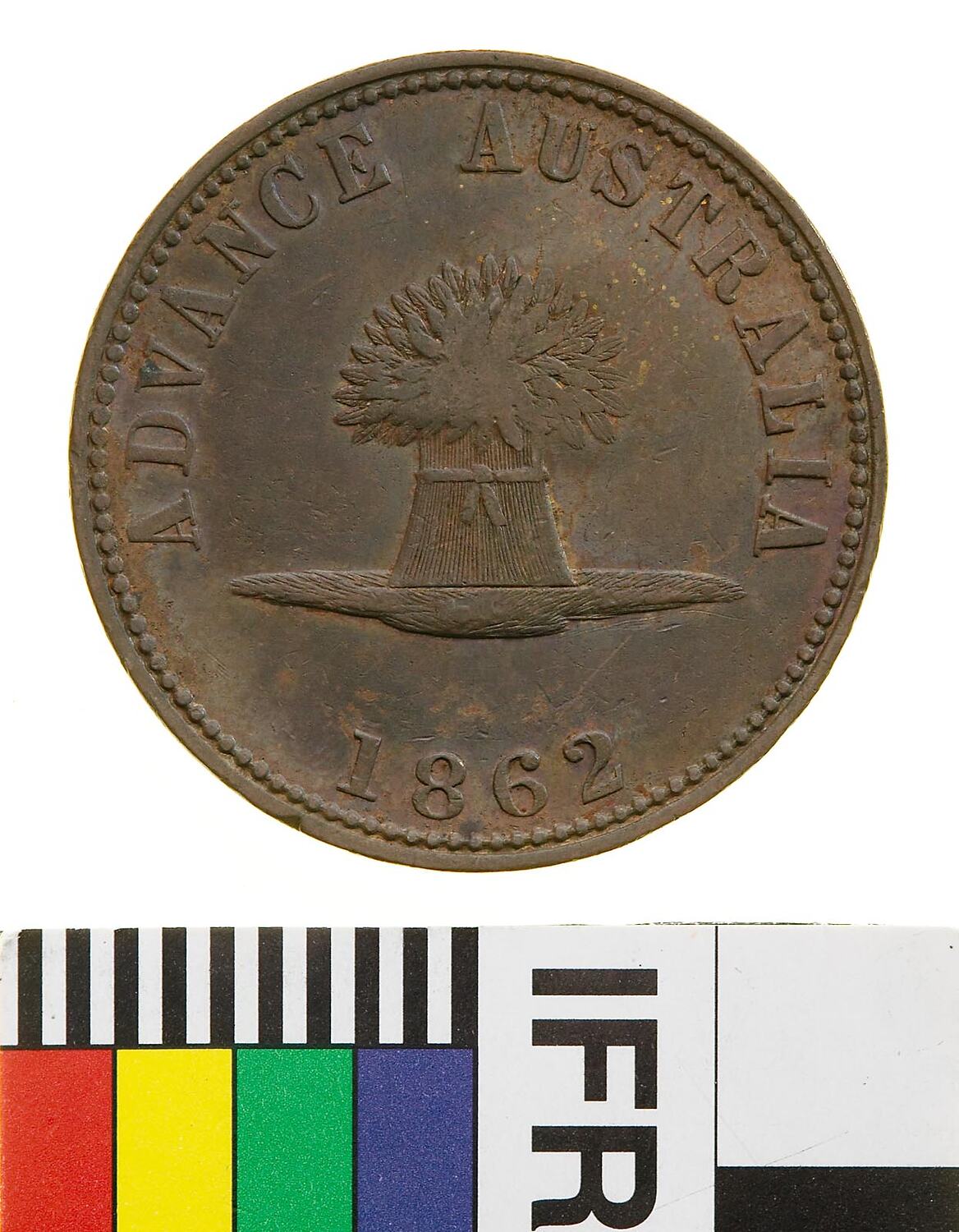 At centre a wheat sheaf tied with a cord 5.7 mm long, above, ADVANCE AUSTRALIA; below, 1862 border of 113 beads. (Stock reverse Andrews type 22 = Heyde Sheaf 2 = Sharples Sheaf 2)