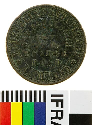 A round copper token (34 mm diameter) with the name, address and business of the issuer: Barroclough, 100 Bridge Road, Richmond, Bookseller and Stationer. The reverse is a Stokes stock Arms : Coat of arms consisting of a central shield set on grass covered ground and below Rising Sun. On left a kangaroo seated facing out but head back towards sun (sejant sinister reguardant) and on right emu with similar stance (passant dexter reguardant). Below ground line and set on bouquet of rose, thistles and shamrock, a ribbon with the motto ADVANCE AUSTRALIA. The shield is quartered by a cross with a star at the centre and at the end of each arm. The cross is shaded with horizontal and vertical lines, hatched around the stars. The quarters contain: top left, a three-masted sailing ship; top right, a golden fleece; bottom left, an anchor; and bottom right, a wheat sheaf. Around above, VICTORIA . 1862 around below in two lines, T. STOKES MAKER / 100 COLLINS ST. EAST MELBOURNE surcharged J.M.
