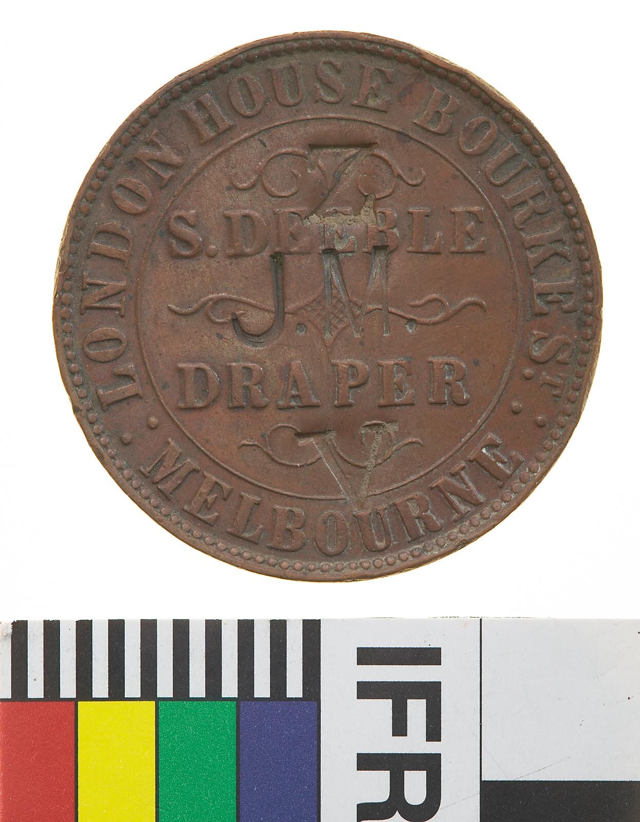 A round copper token (34 mm diameter) giving the name address and business of the issuer: S. Deeble, London House Bourke St. Melbourne, draper surcharged J.M. Z and V. The reverse features a wheat sheaf.