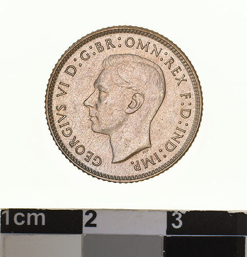 A silver coin (19 mm diameter with milled edge) featuring a bare head of George VI facing left; around, GEORGIVS VI D: G: BR: OMN: REX F. D. IND: IMP. ; below bust in small lettering the artist's initials H.P.. The reverse features the Ensigns Armorial of the Commonwealth of Australia, as authorised by Royal Warrent 7th May 1908 - composed of a simple shield enclosing a cross of Saint George on which are five six-pointed stars, around the outside of which are six small escutcheons, i.e., small shields. The shield is supported by a kangaroo and an emu standing on a grassy mound. Above the shield a crest, the seven-pointed star of Federation on a wreath. Below on a ribbon the motto ADVANCE AUSTRALIA is inscribed. Around above, SIXPENCE and below, between arrow heads, the date, 1942. The mint mark, S, is above the date.