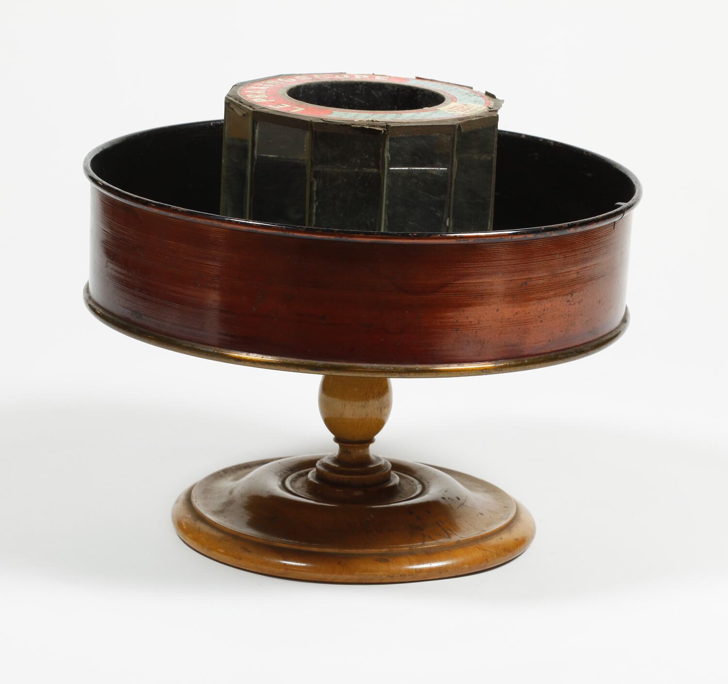 In shape the Praxinoscope resembles a shallow cylinder with a concave base. Around the inner wall is a paper strip, which is changeable, featuring a series of twelve cartoons of a girl in different stages of dancing with birds. In the centre a second cylinder is situated, with twelve mirrors fixed to the outer walls, one corresponding to each image. To create the animation the outer drum is spun, the mirrors reflecting the passing images and giving the effect of fluid movement. There was often a lighting fixture at the top of this central cylinder to illuminate the images; this is missing from this apparatus.