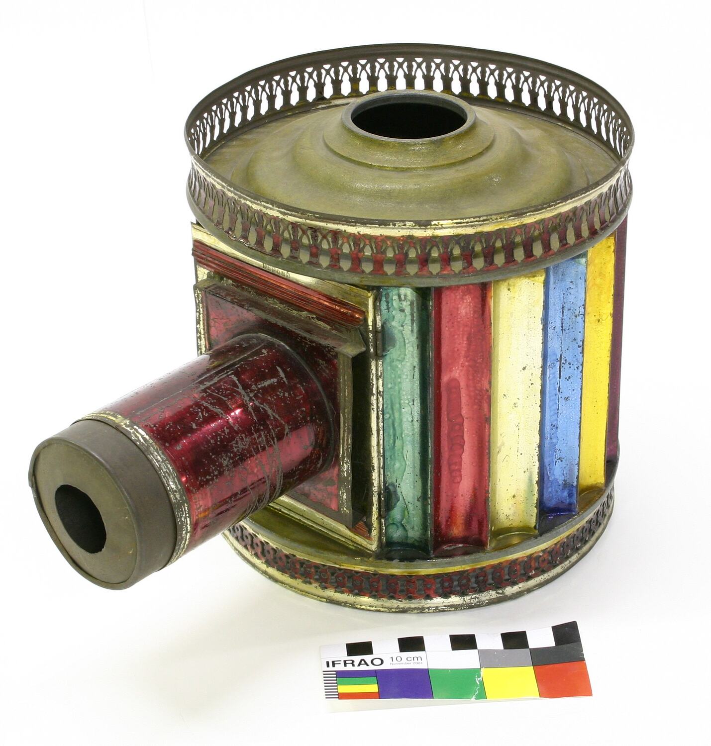 A cylindrical lantern projector lacquered in metallic green, red, silver, blue, gold and purple stripes. Lens with square base-plate is fixed to front of projecter on hinges. Projector has decorative lace-metalwork around top and bottom perimeters. There is a hole in the base and roof of the chimney, designed to accommodate a domestic lamp. The lantern body is physically attached to the lantern chimney, which is registered as HT 3927.