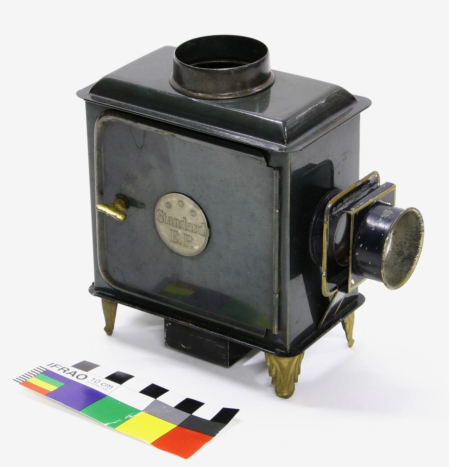 Children's toy magic lantern projector set, designed for domestic use with miniature glass slides. 'Standard E.P.' model manufactured by Ernest Plank, Bavaria, Germany, circa 1879. When new this lantern set came in a box complete with the projector, a small spirit lamp, various accessories and an assortment of slides.