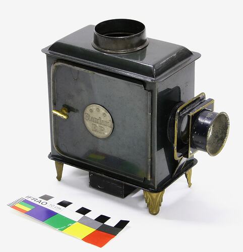Boxed lantern set comprising box, toy lantern and illuminant. The box is a black papered wooden box, with a label featuring a domestic slide show conducted by a boy. Various medals are shown on the lower margin of the label. The toy lantern is a japanned black "E.P. Standard" box toy with ornate feet. It has a side door for access to lamp. A round emblem is fixed onto side door. The illuminant used is a small hurricane oil lamp.