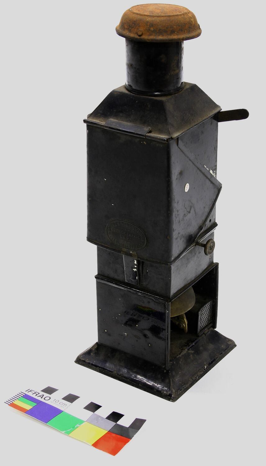 An upright, rectangular, black, metal oil lamp. Designed with four segments: the bottom segment has only three walls and houses the stand for lamp wick; the second segment holds paraffin oil to fuel lamp; the third segment has a lift up shade to direct light onto the lecturer's papers and a glass to keep the flame away from papers, on the opposite side of this segment there is a red lens, concealed by a shutter, which can be exposed by raising a brass handle so that the projectionist can see when to put up the next slide; the fourth / top segment is a chimney with a rounded, metal cap at the top.