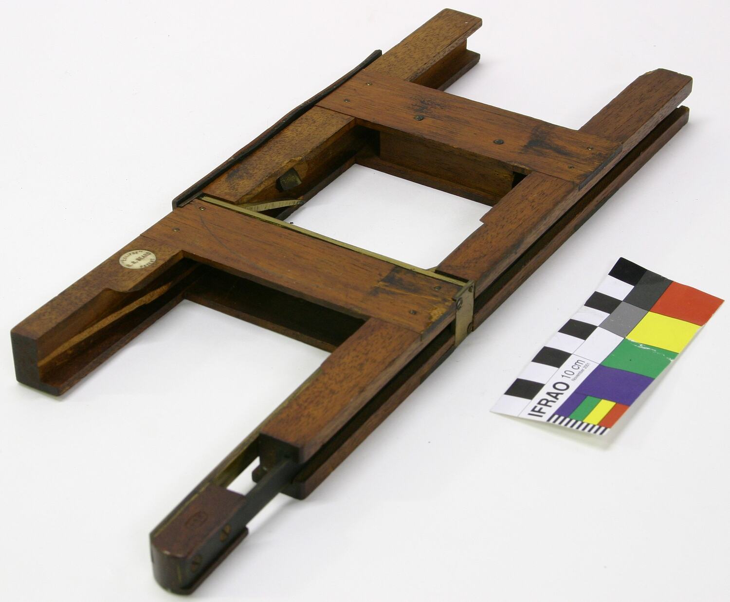 Wooden slide changer with brass fittings. It has two long strips of wood forming the framework, with two shorter pieces added perpendicularly to form a square in the centre, where slide is to sit. The longer arm forming the top of the frame has a strip of rubber attached to the top, the bottom one has a "runner" to which slides are added and moved through the lantern projector. It has an ivory emblem attached.