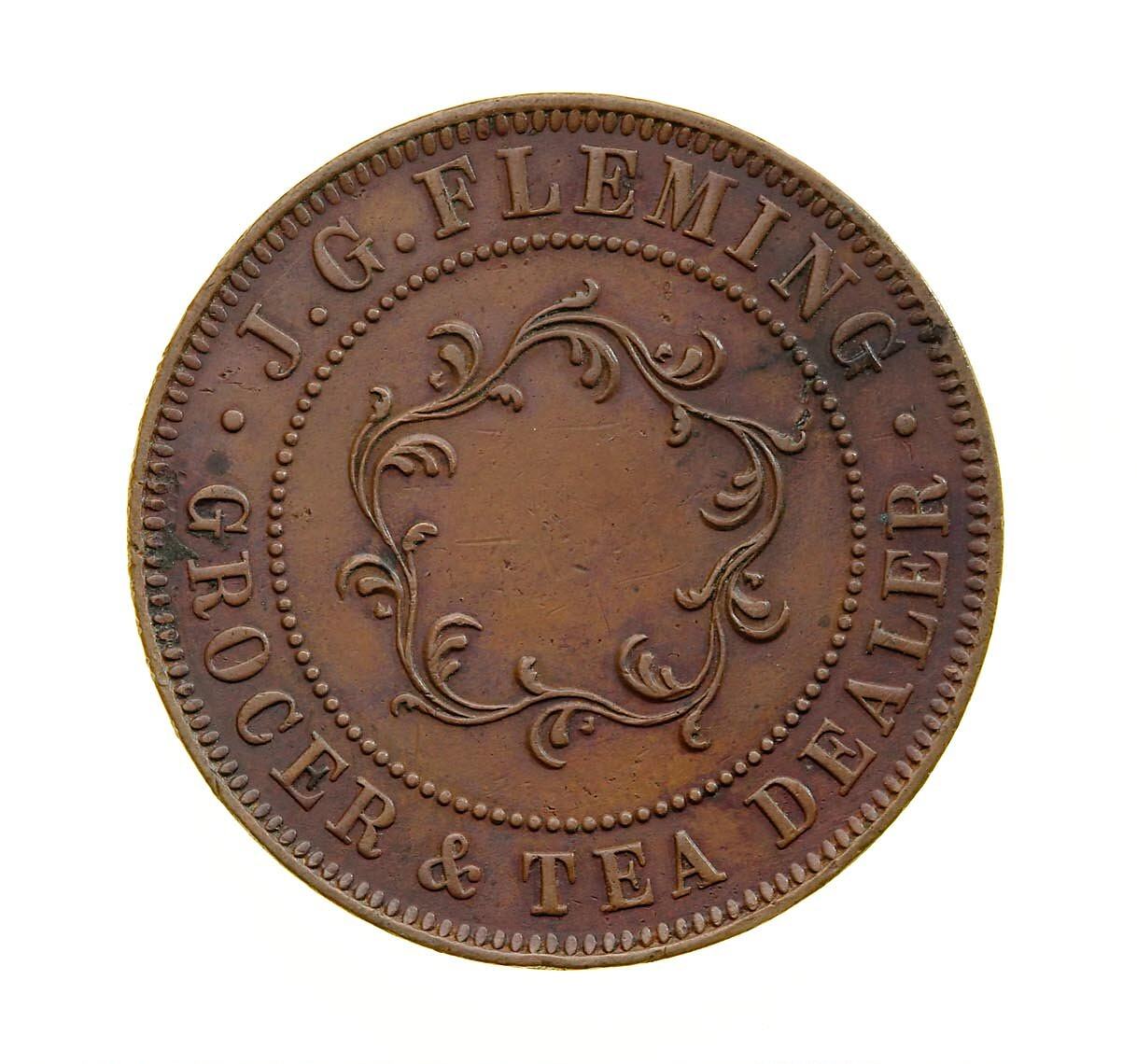 A round bronze token (31 mm diameter). The token features the name, address and business of the issuer: J.G. Fleming, Sugar Loaf, Hobart Town, grocer & tea dealer. The obverse features a circular scroll work and the reverse a sugar loaf stamped F.