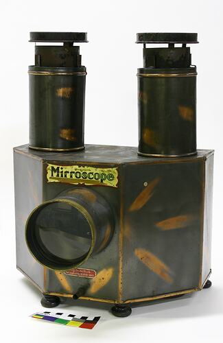 The mirroscope was made by the Buckeye Stereopticon Co., Cleveland, Ohio, USA. Four models were offered by Gamages Ltd (London) in 1913, at prices from 15 - 42 shillings. This example is an improved model, with the addition of the two heat stacks directly above the light bulbs, designed to allow the heat to escape while preventing light from entering.
