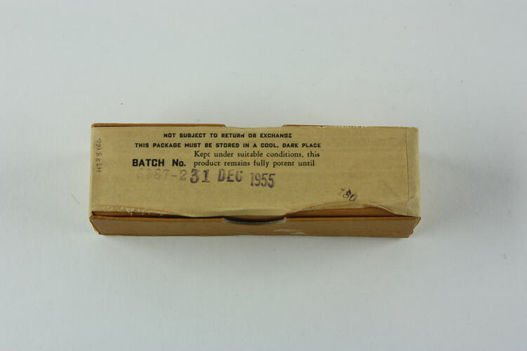 Tiger snake antivenom in cardboard box. Possibly part of Snake Bite Treatment Kit (cardboard display board with objects mounted for display) - 1953 display board. Used by Commonwealth Serum Laboratories, (CSL) Ltd, Parkville, Victoria.
