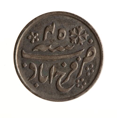 In 1801 the East India Company obtained control of territory once under the Nawab of Oudh and the Nawab of Farrukhabad. To provide coinage for their new territories it was decided to strike a rupee (and fractions) of the same size and silver fineness as the perpetual 19 san sicca being struck at Calcutta for Bengal. The new coin would be known as the Lucknow sicca rupee of the 45th san, a mint was established at Furrukhabad to strike them with the mint name Farrukhabad in the line below the Regnal year. Like the 19 san sikka the date on the 45 san sicca was frozen. In 1817 the right to strike this coin was extended to the Calcutta and Banaras mints. This coin was struck at Calcutta as it bears a small crescent on the obverse near the rim at 9 o'clock - the mint name on the reverse is the standard form for this coin, Farrukhabad. It belongs to the third Calcutta form, with a plain edge. Calcutta continued to strike the 45 san coinage until 1834 with variations of the edge form.