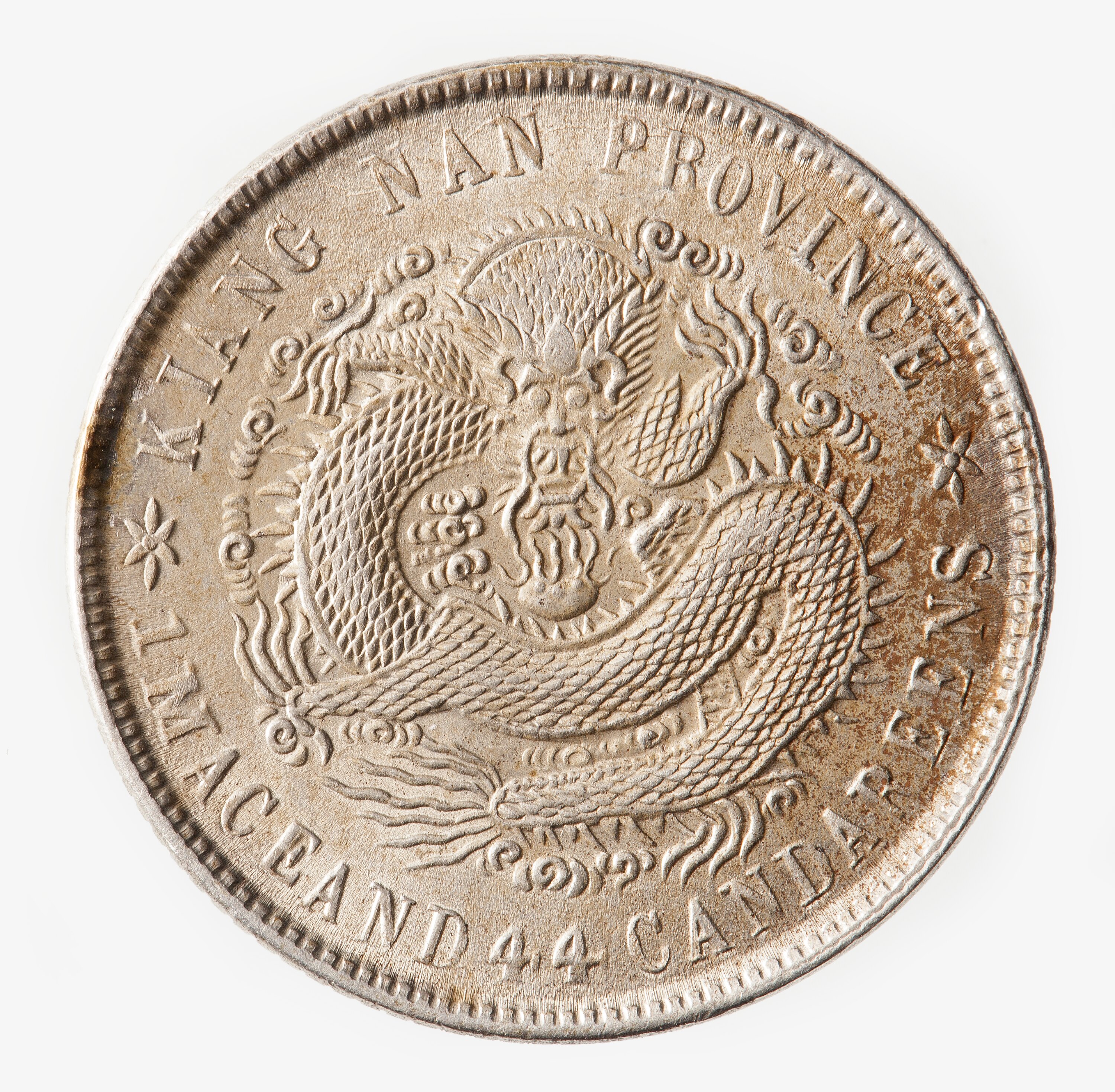 At centre, a dragon facing; around above, KIANG NAN PROVINCE; around below, 1 MACE AND 44 CANDAREENS