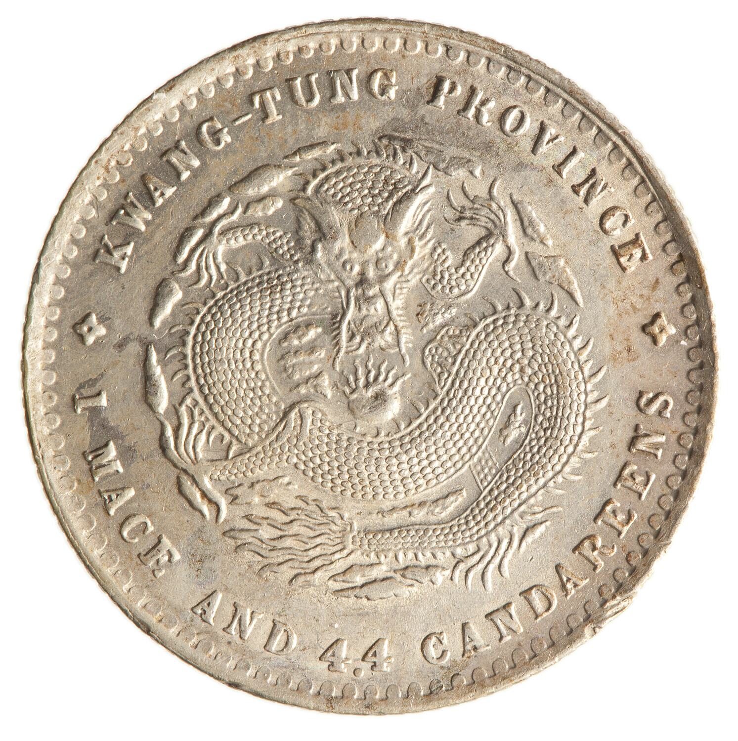 At centre, a dragon facing; around above, KWANG-TUNG PROVINCE; around below, 1 MACE AND 4.4 CANDAREENS