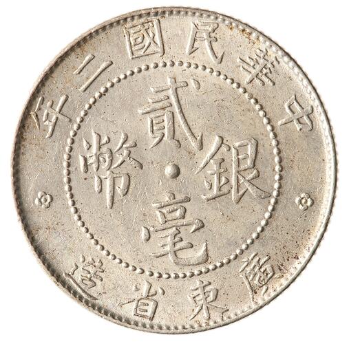 20 Cents, Issued by Kwangtung, China, Year 2 (1913)