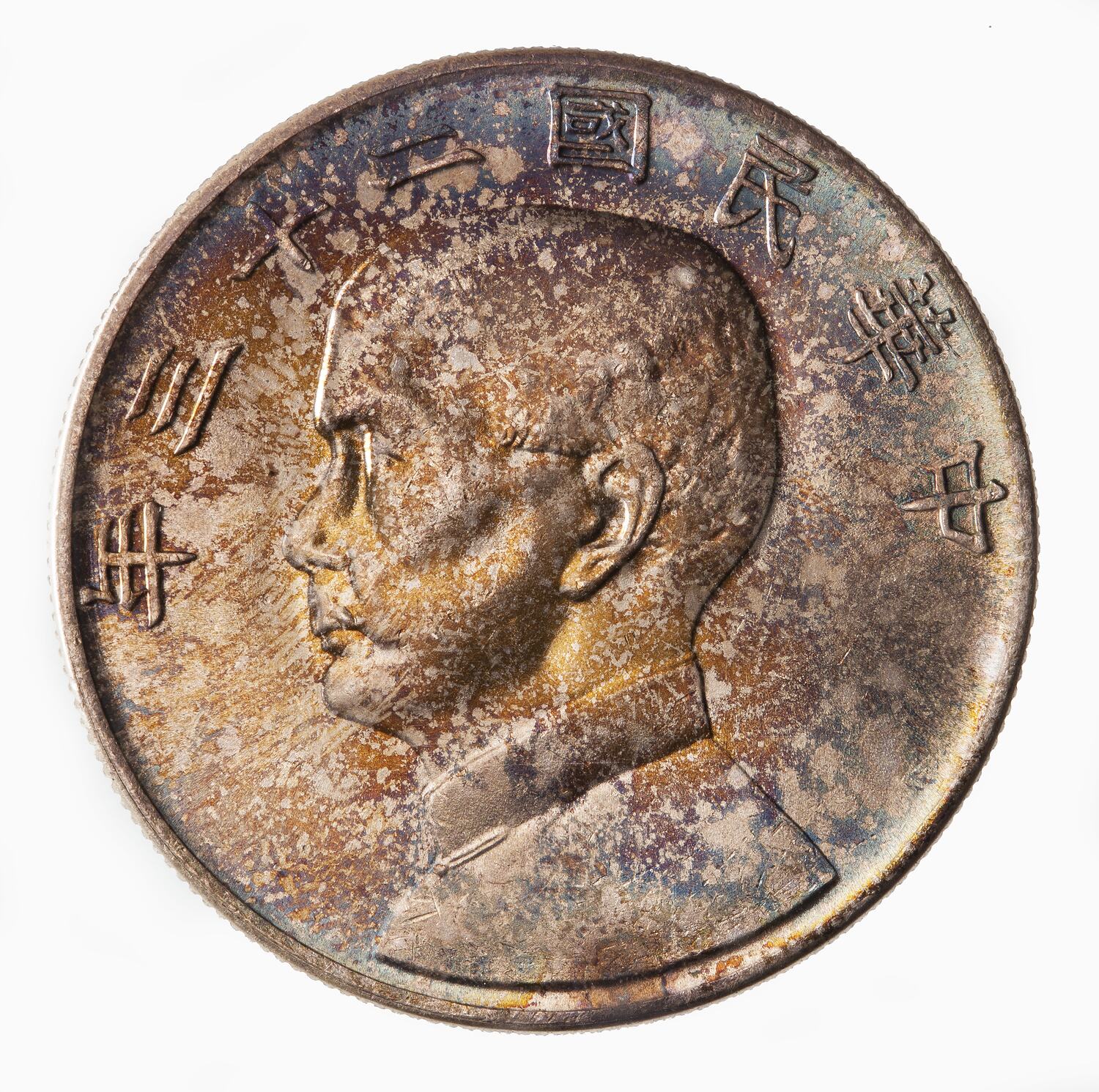 Bust of Sun Yat-sen left, around above Chinese legend (8 characters)
