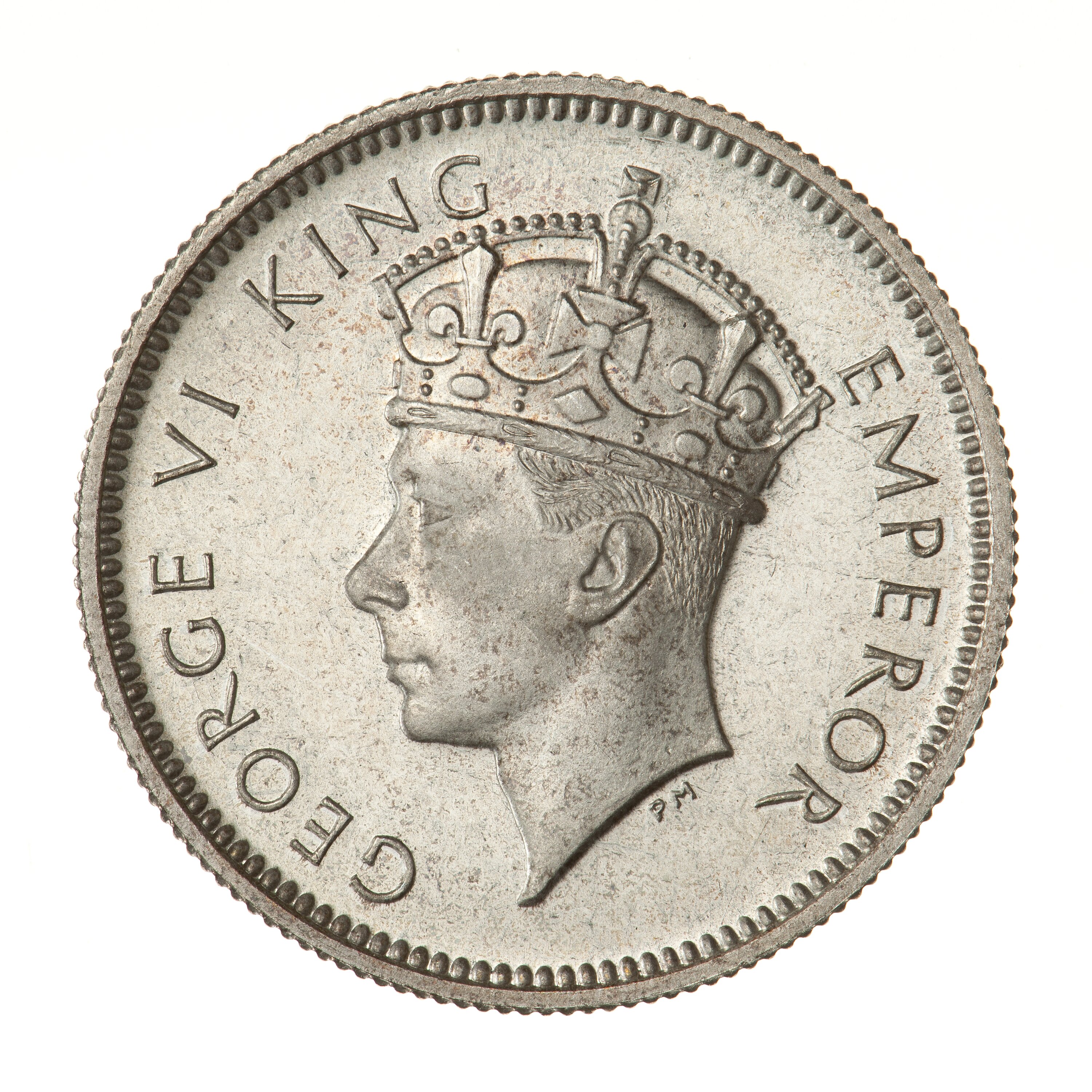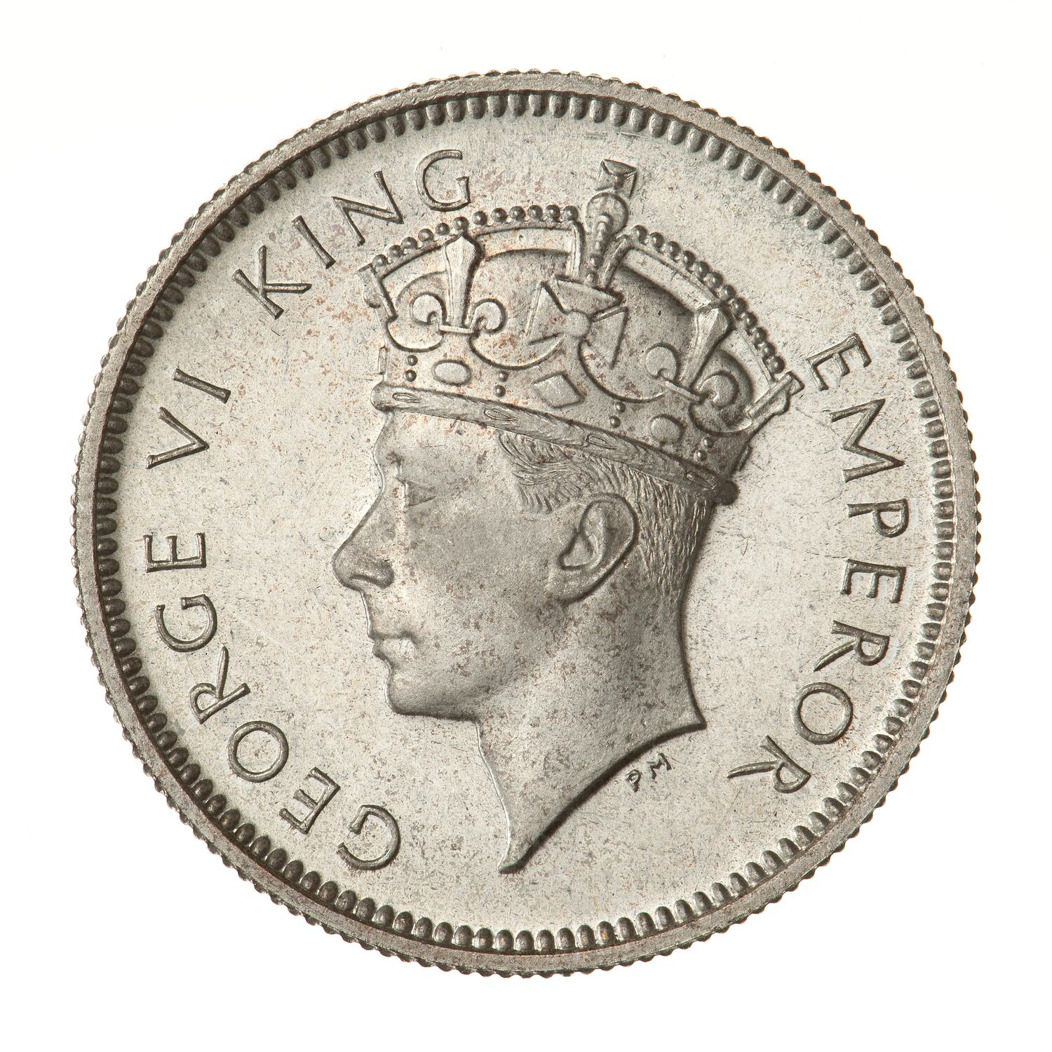 Crowned bust of the King facing left; around, GEORGE V KING EMPEROR; artist's initials, PM, below neck truncation