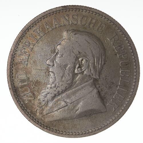 Draped bust of Paulus Kruger facing left; around, ZUID AFRIKAANSCHE REPUBLIEK