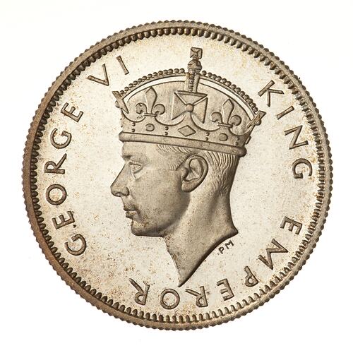 Crowned bust of the King facing left; around, GEORGE VI KING EMPEROR, artist's initials, KG, below neck truncation